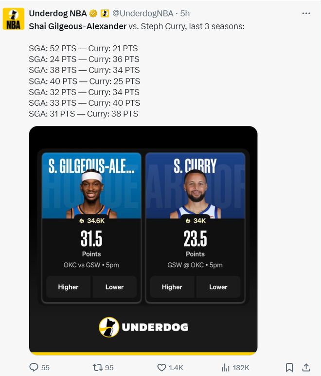 而且美媒晒出最近三个赛季,SGA面对库里的数据,两人的得分是互有胜负的,美媒希望这场比赛两人继续对轰。