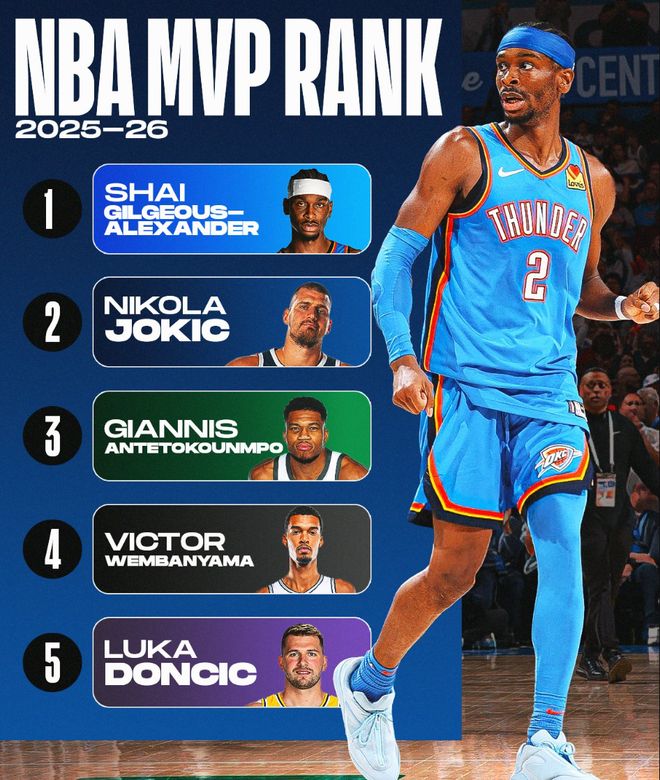 SGA所在的雷霆稳居西部第一,SGA的个人数据也十分出彩,那么他稳居MVP榜单第一就是板上钉钉的事情,今年很有希望连庄常规赛MVP。