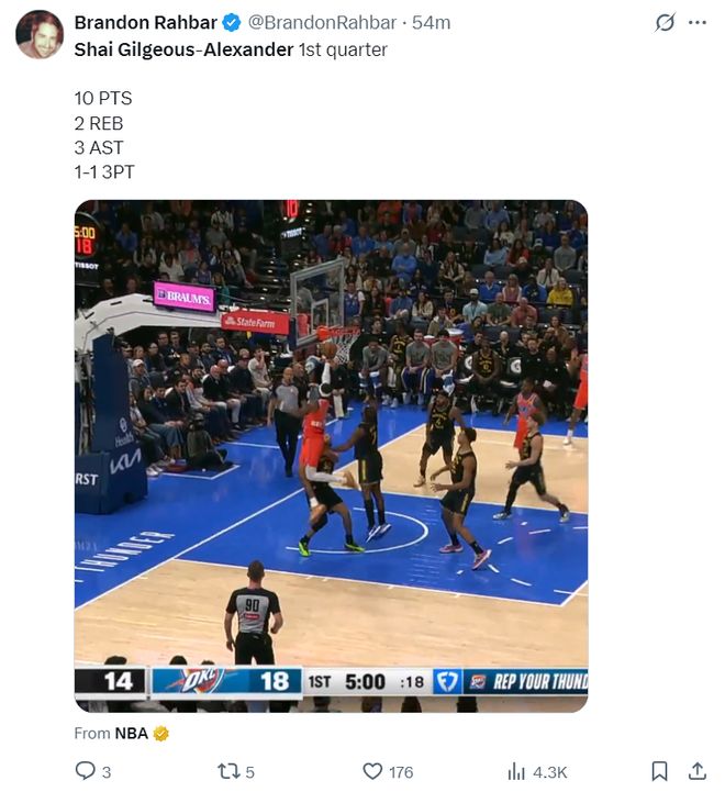 首节SGA7中3,拿到10分3助攻2篮板,还制造了库里一个2+1;上半场打完SGA15分6助攻3篮板,在亚历山大还没有尽全力时雷霆已经领先勇士19分之多了。
